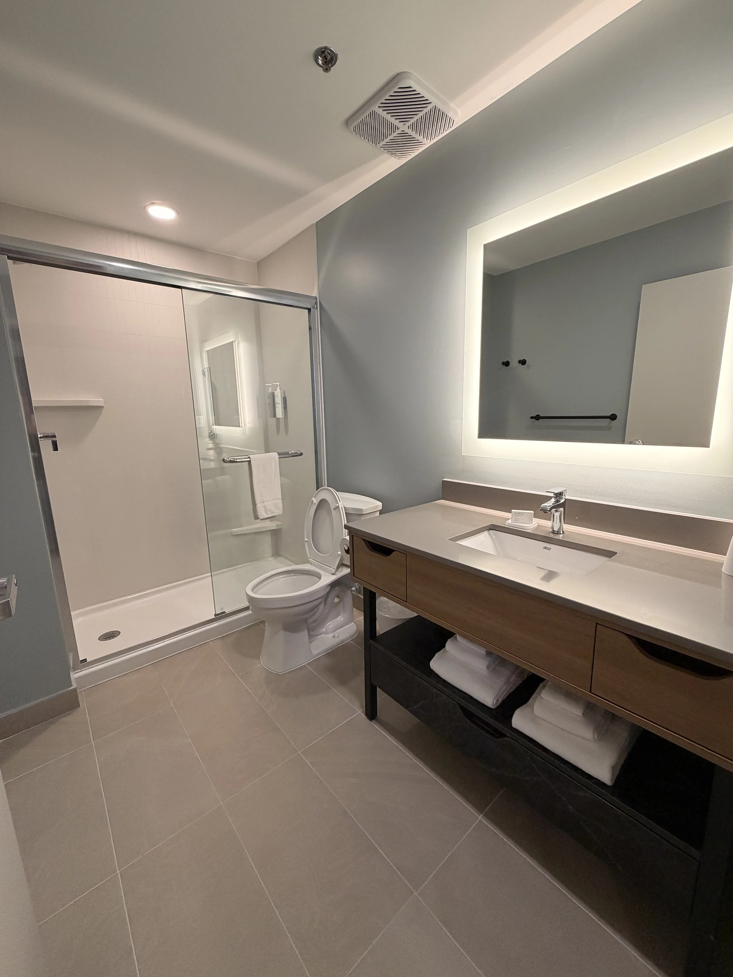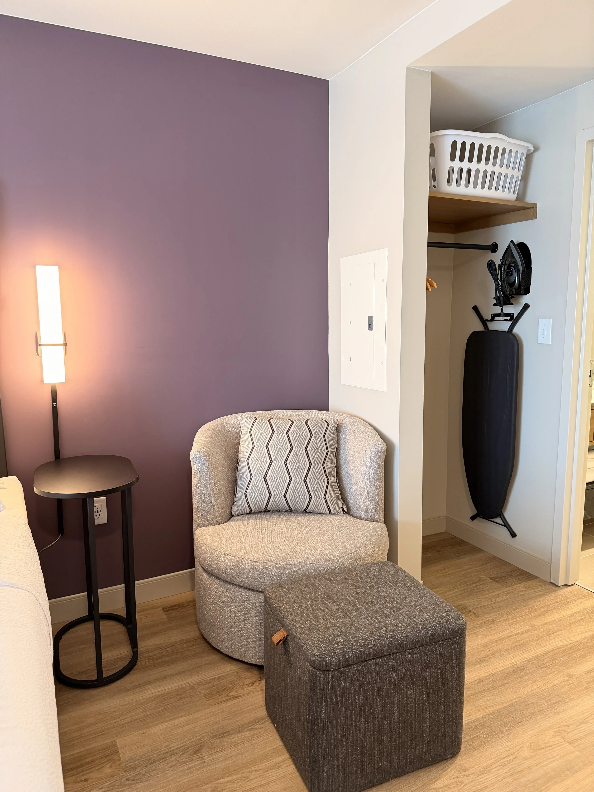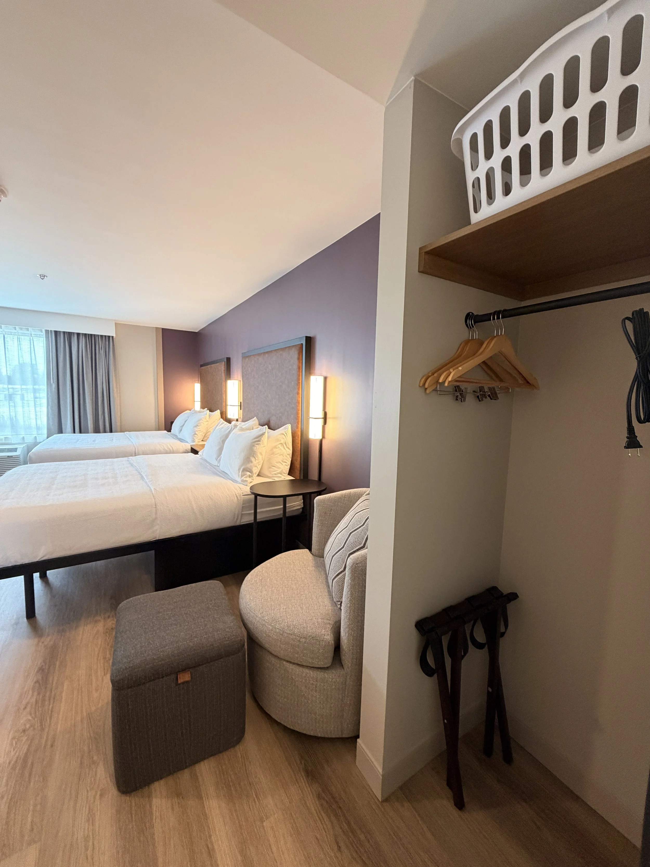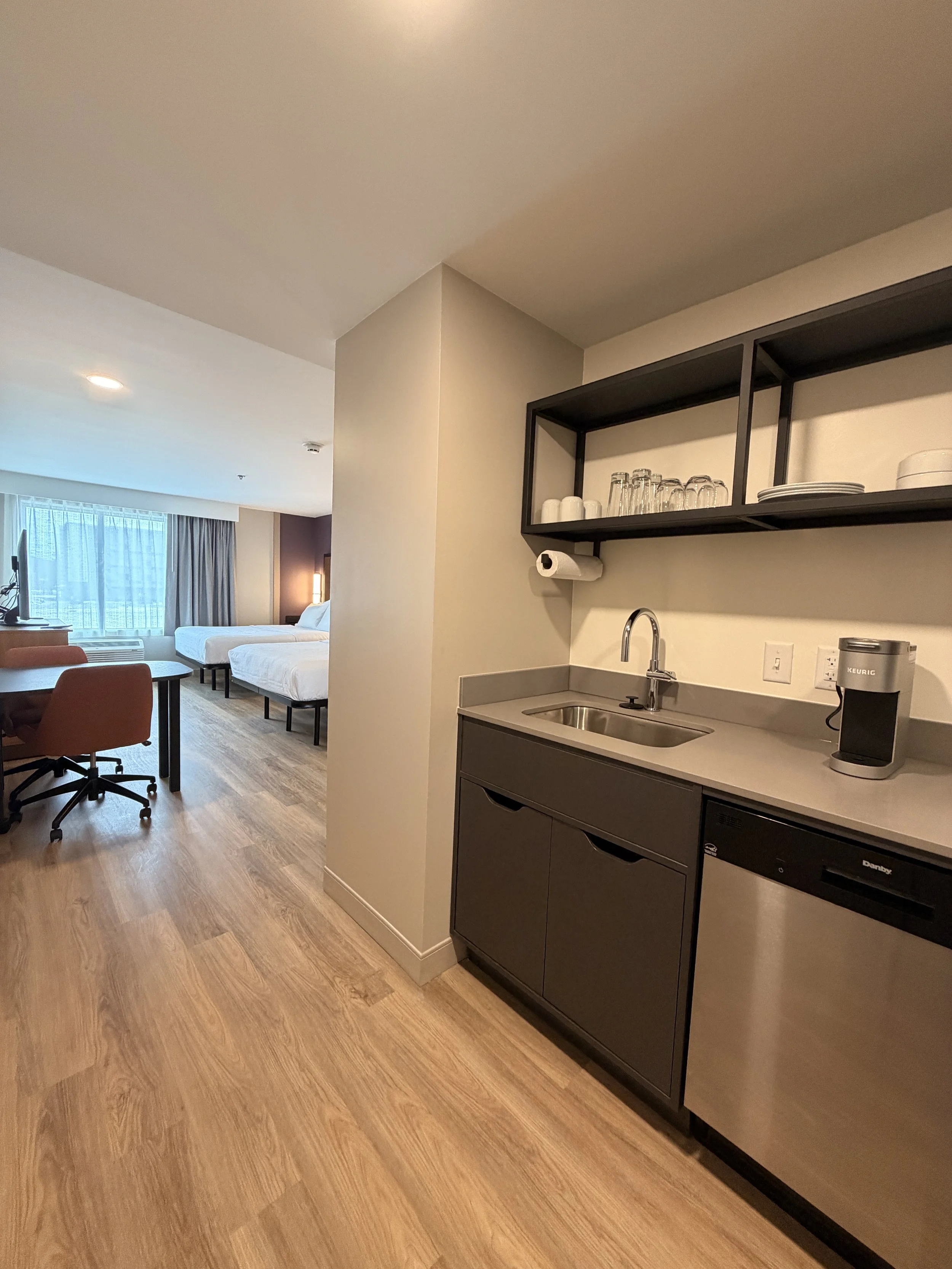 Inside, the hotel feels more like a modern apartment building than a typical hotel. There are 137 studio-style suites, each with its own full kitchen (yes, dishwasher and cooktop included), tons of storage and flexible furniture so guests can cook, work, relax and actually live comfortably during long stays.