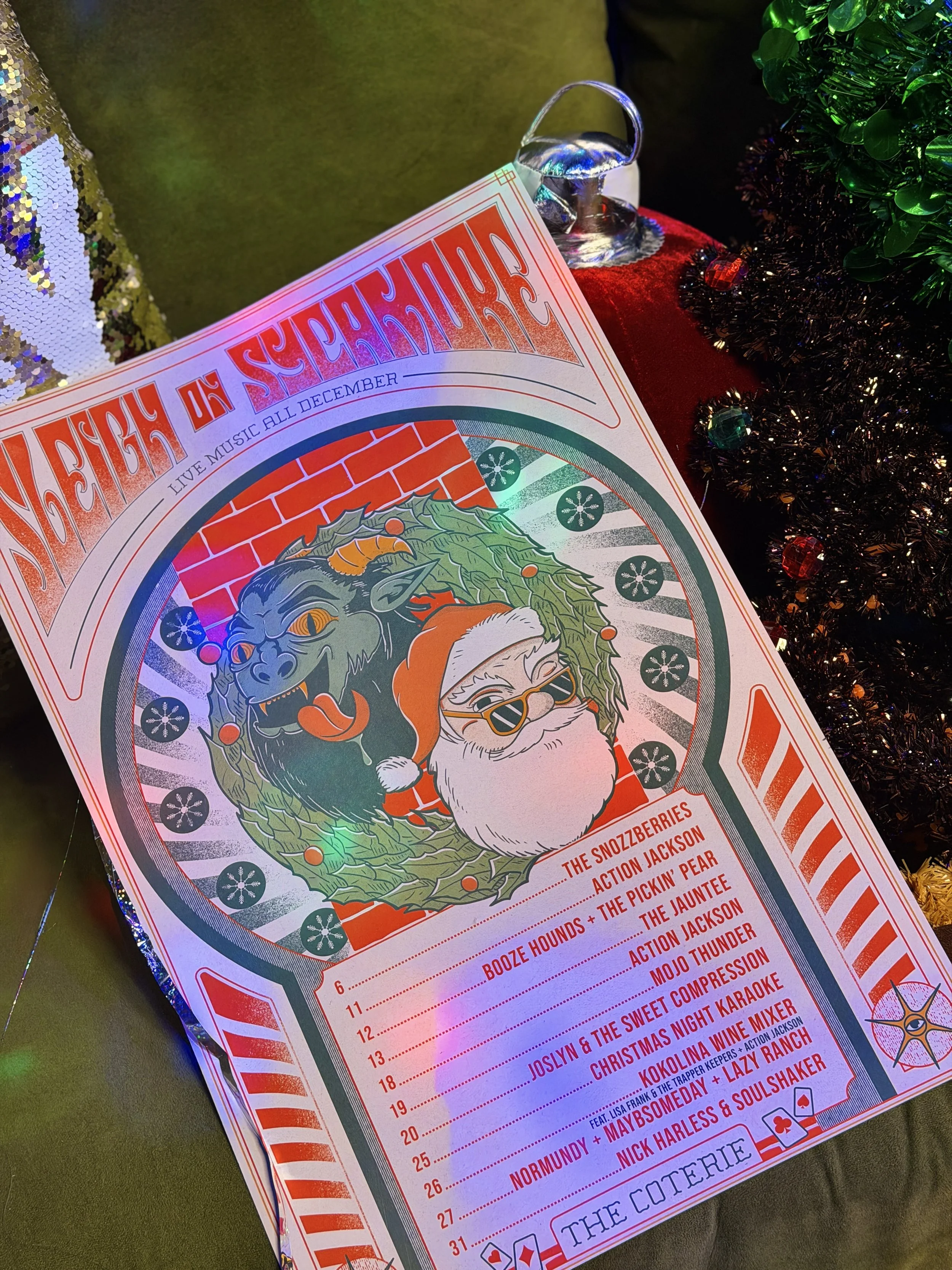 Get excited, Kokomo! Sleigh on Sycamore is back at The Coterie and the holiday chaos officially kicks off tomorrow, Dec. 6! If you went last year, you already know this isn’t just a little seasonal sprinkle. The Coterie has transformed once again for the holiday season, dripping from floor to ceiling in tinsel and ready to welcome everyone on the nice list… and especially the naughty list for a full month of festive fun.