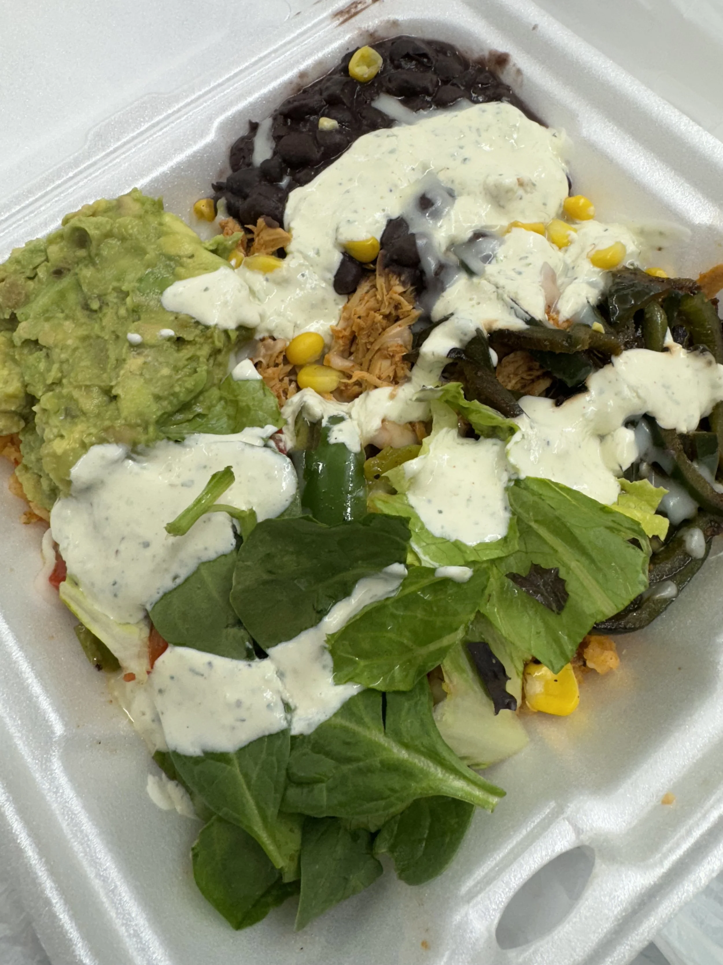 This local option gives you Chipotle-adobo fork-shredded chicken on a generous layer of Spanish rice with shredded mozzarella cheese, roasted corn, black beans, grilled poblano and bell peppers, spring lettuce and cucumber all topped with a cilantro lime dressing. Smells great and tastes even better. Yum.