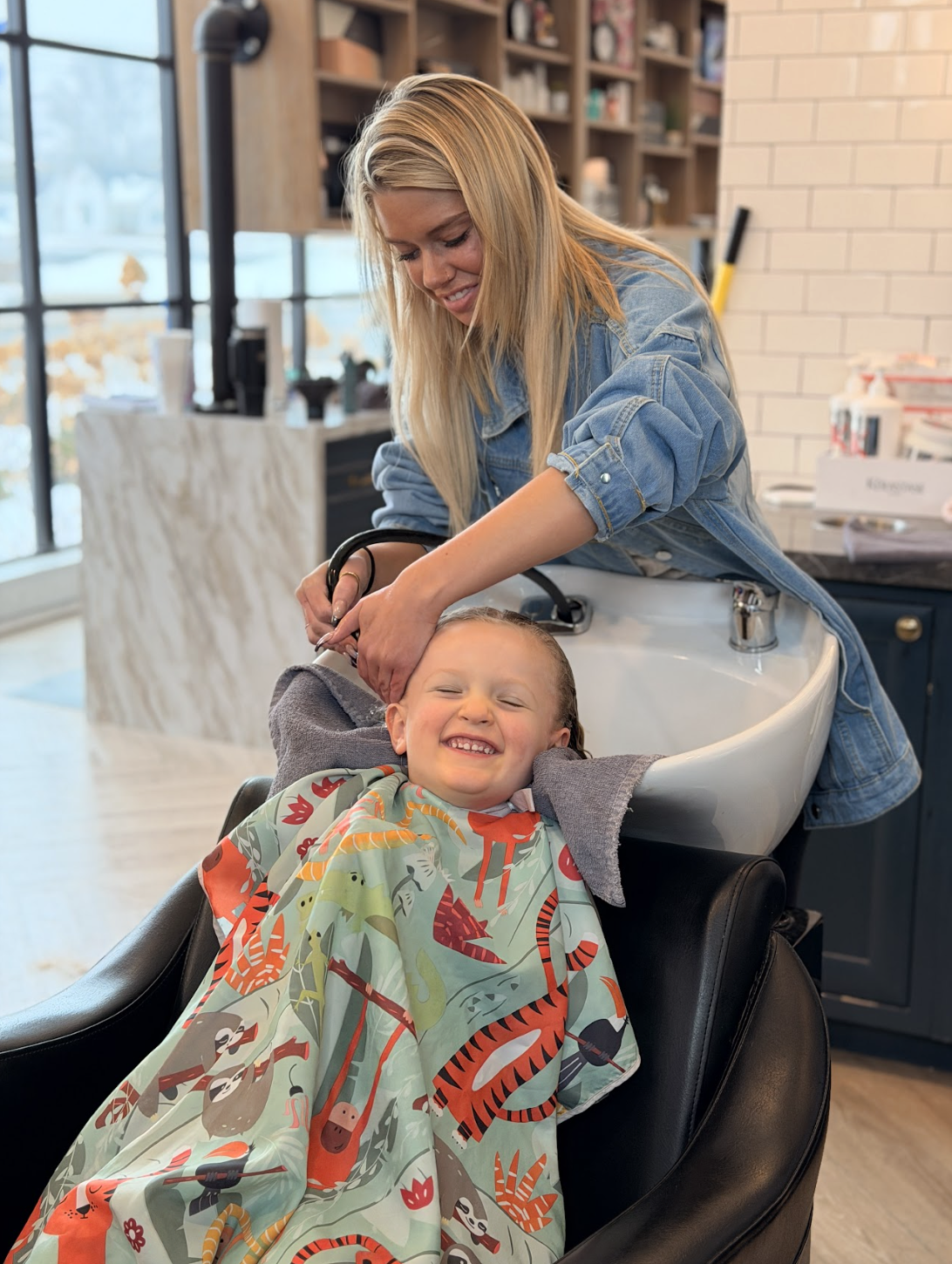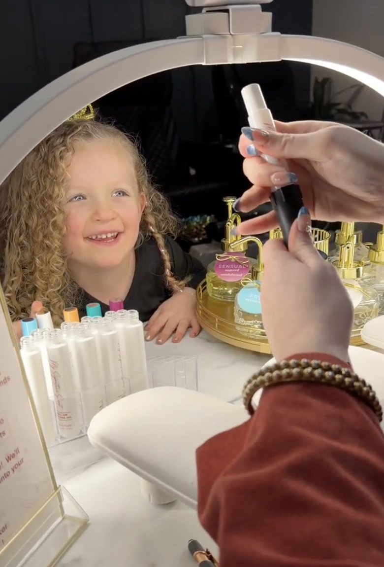 The day started at the sink with a hair wash and this wasn’t just a quick rinse. It was a full pampering moment that immediately made her feel so grown up. She leaned back, relaxed and soaked in every second while her hair was washed and cared for. It was the perfect start to her princess experience.