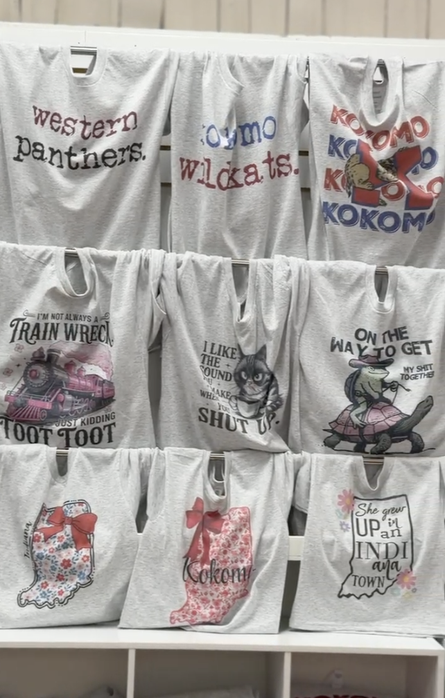 One of the biggest highlights of The T-Shirt Shop is the wall of spirit wear. You’ll find designs representing local high schools, local sports teams, hometown pride, and Kokomo-themed apparel. But don’t expect boring or outdated designs, these pieces are modern, trendy, and genuinely wearable.
