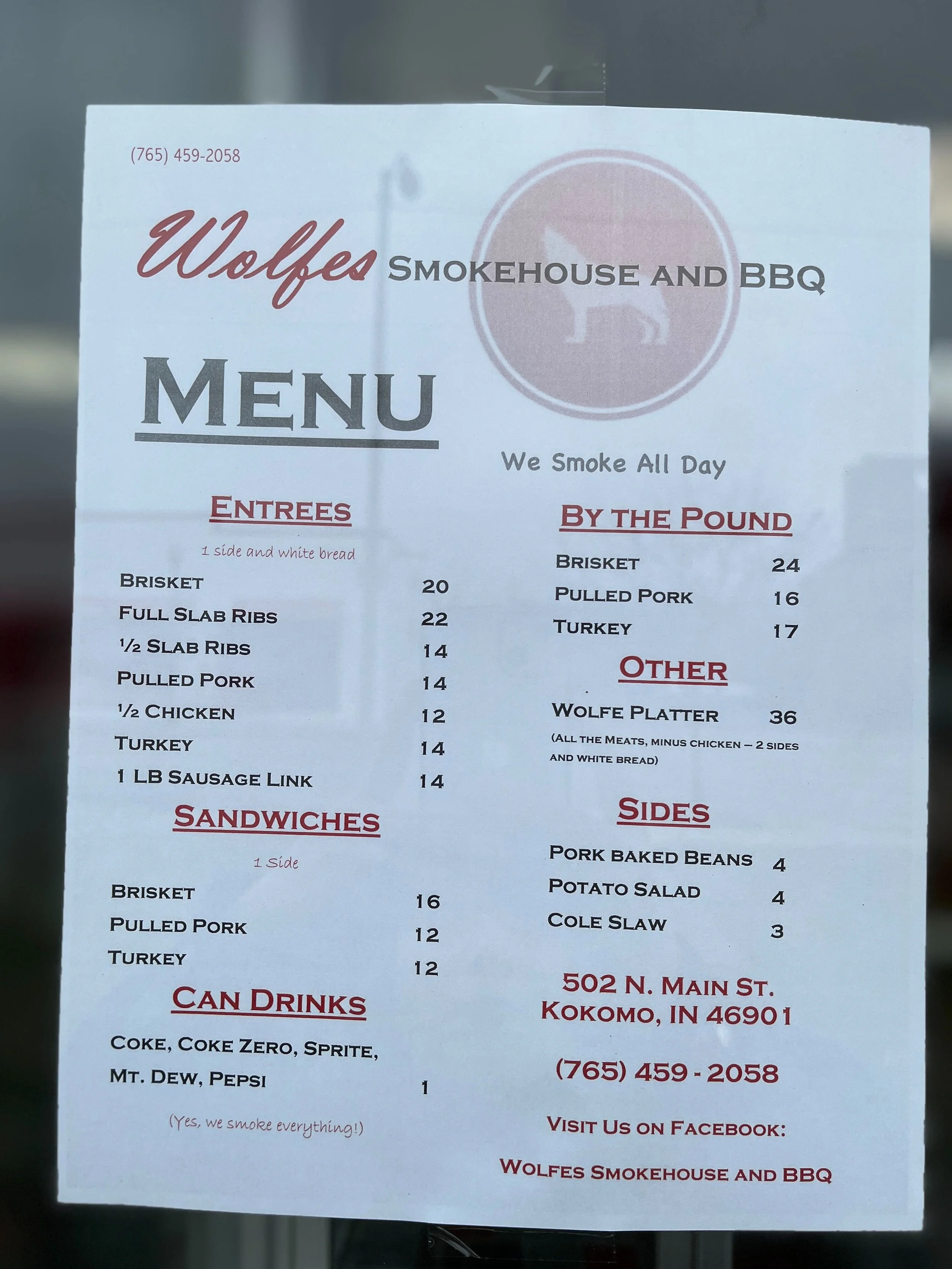 Wolfes Smokehouse & BBQ is bringing flavor to downtown Kokomo. Wolfes is a Texas-style smokehouse offering brisket, ribs, pulled pork, chicken, turkey and sausage. Owner Michael Wolfe says the barbecue spot is set to open at noon on Friday, Feb. 17, and stay open until they sell out. You’ll be able to drive through, call ahead or carry out items from the full menu.