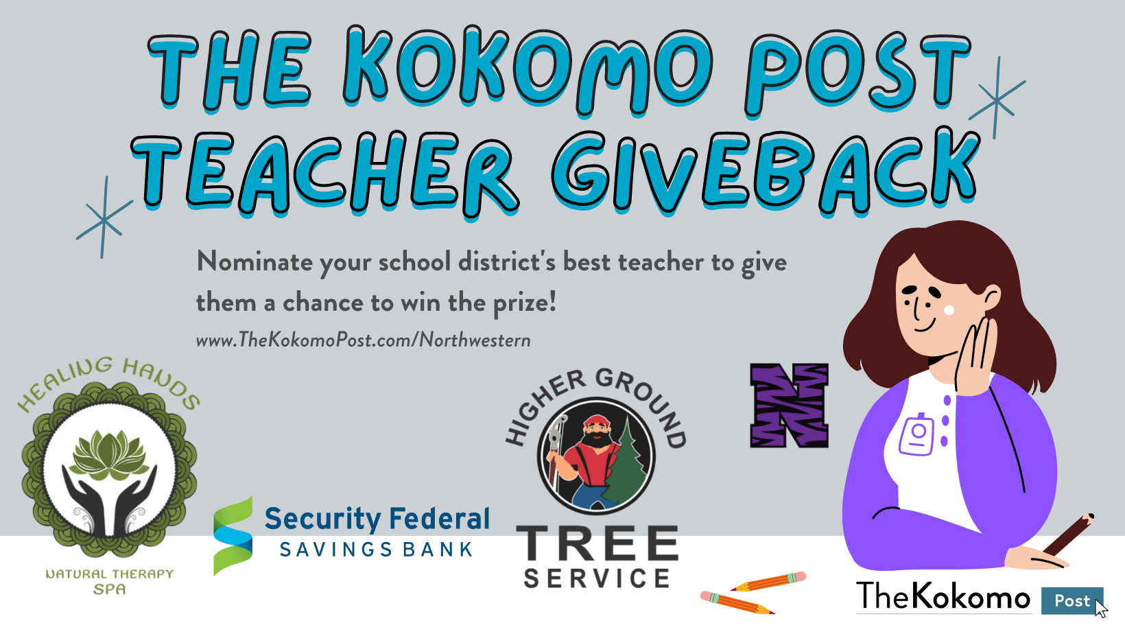The Kokomo Post Teacher Giveback is a five-week campaign, partnered with Healing Hands Spa, Security Federal Savings Bank, and Higher Ground Tree Service, to give each school district’s community a chance to show their appreciation for a specific teacher or educational professional.