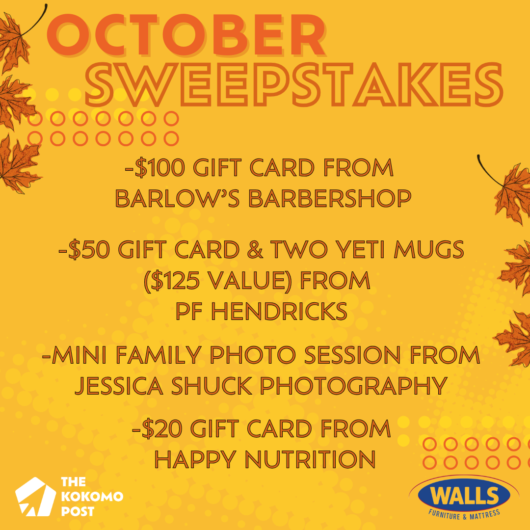 The contest runs from October 1 through 11:59 p.m. on October 31, and the winner will be announced on November 1. No purchase is necessary. Must be 18 or older to win. Staff and family of The Kokomo Post and Larison Media employees are not eligible to win. The Kokomo Post advertising partners are not eligible to win. Previous sweepstakes winners are not eligible to win in a single calendar year. Only one entry per person will be permitted. By entering the sweepstakes, you opt-in to marketing material from The Kokomo Post and our partners.