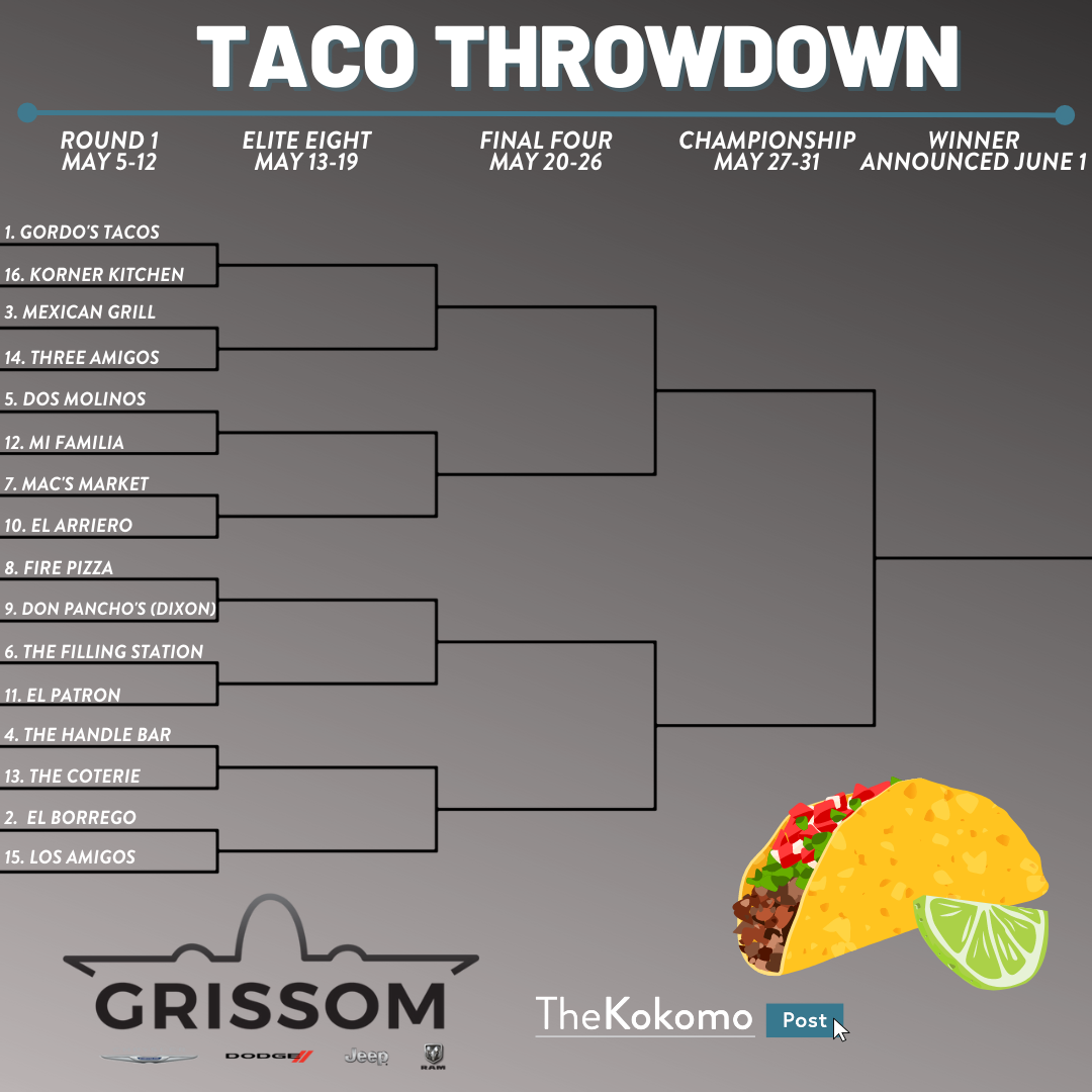 Place your vote below in the first round of the 2022 Kokomo Post Taco Throwdown, partnered with Grissom Chrysler Dodge Jeep and Ram, by clicking on the logo of your favorite taco spot in each matchup! The first round runs from May 5 through 12, and you may vote once per hour.