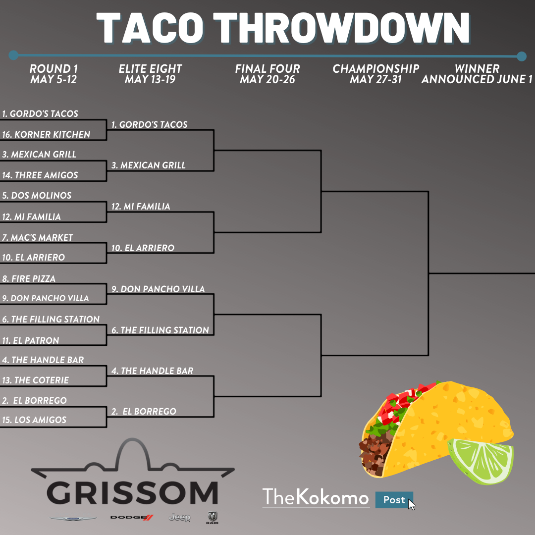 Place your vote below in the Elite Eight round of the 2022 Kokomo Post Taco Throwdown, partnered with Grissom Chrysler Dodge Jeep and Ram, by clicking on the logo of your favorite taco spot in each matchup! The second round runs from May 13 through 19, and you may vote once per hour.