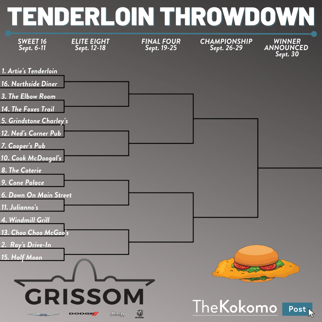 Place your vote below in the first round of the 2022 Kokomo Post Tenderloin Throwdown, partnered with Grissom Chrysler Dodge Jeep Ram, by clicking on your favorite tenderloin spot in each matchup! The first round runs from Sept. 6-11, and you may vote once per hour.