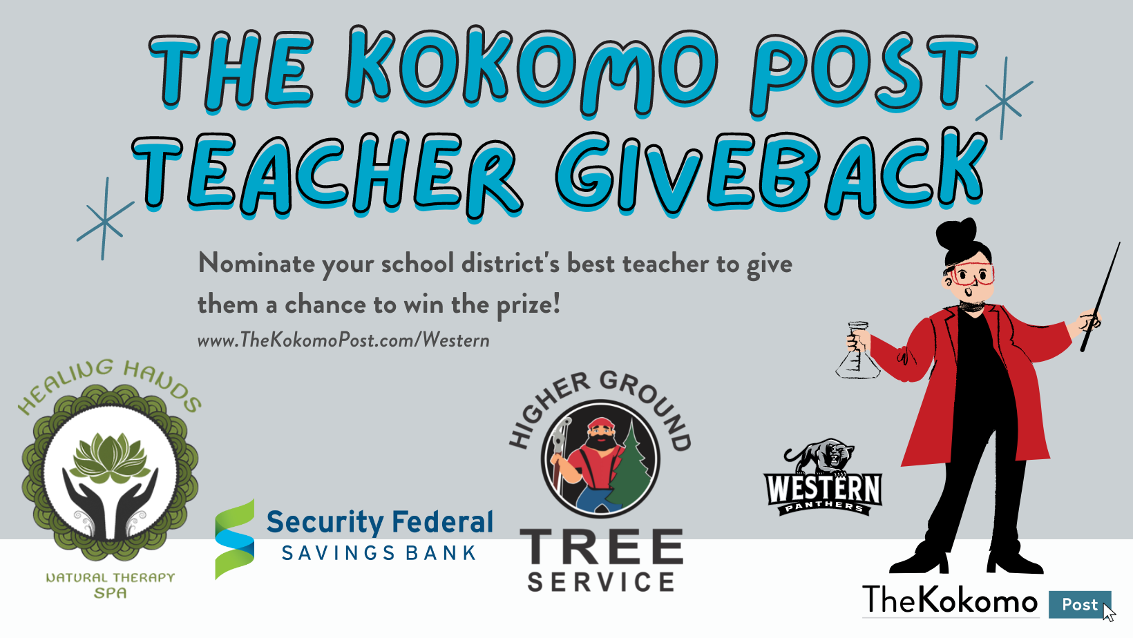 The Kokomo Post Teacher Giveback is a five-week campaign, partnered with Healing Hands Spa, Security Federal Savings Bank, and Higher Ground Tree Service, to give each school district’s community a chance to show their appreciation for a specific teacher or educational professional.